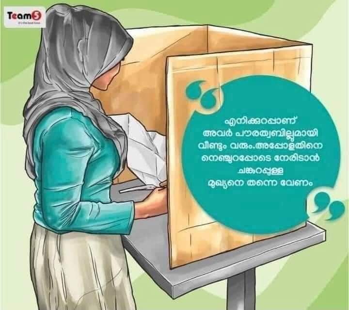 A billboard by the state highway in Thritala constituency has the above words. It shows a woman in a headscarf inside a polling booth.