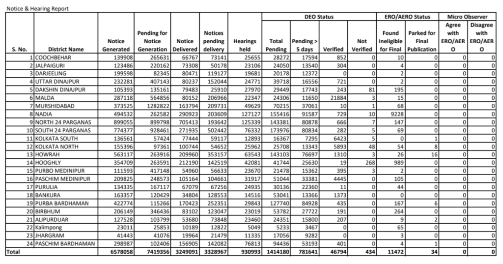 The situation is similar in Malda, where, despite a negligible 1.88% “No Mapping” rate, 28.42% of the electorate is under scrutiny, while only 2.62% of hearings have been completed. It would mean that hundreds of thousands of notices could be generated only at the last minute, leaving voters with virtually no time to respond. This has also made the entire exercise appear administratively unviable and uneven. Mere procedural failures could lead to the deletion of voters from the electoral roll, and particularly at risk are those belonging to the minority communities.