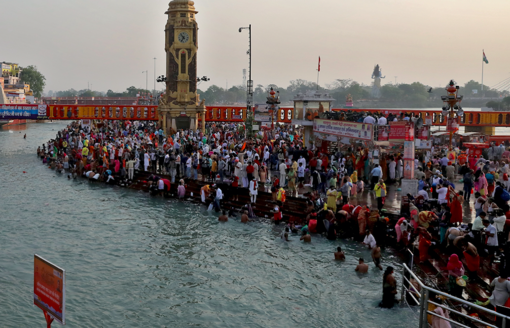 Devotees gather to take a holy dip in the waters of river Ganges during Kumbh Mela, or the Pitcher Festival, amidst the spread of the coronavirus disease (COVID-19), in Haridwar, India, April 12, 2021. Photo: Reuters/Anushree Fadnavis