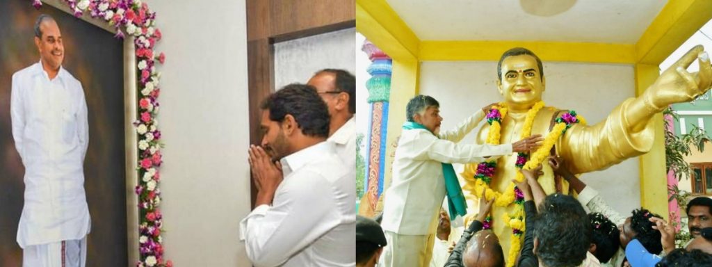 Left: Y.S. Jaganmohan Reddy with a portrait of his father Y.S. Rajasekhara Reddy. Right: Chandrababu Naidu garlanding a statue of his father-in-law N.T. Rama Rao.
