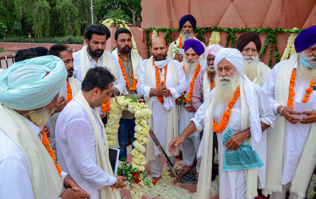 Family members of the Martyrs of Jallianwala Bagh pay tribute to them during the inauguration of Jallianwala Bagh Martyrs memorial, in Amritsar, Saturday, Aug 28, 2021. Photo: PTI