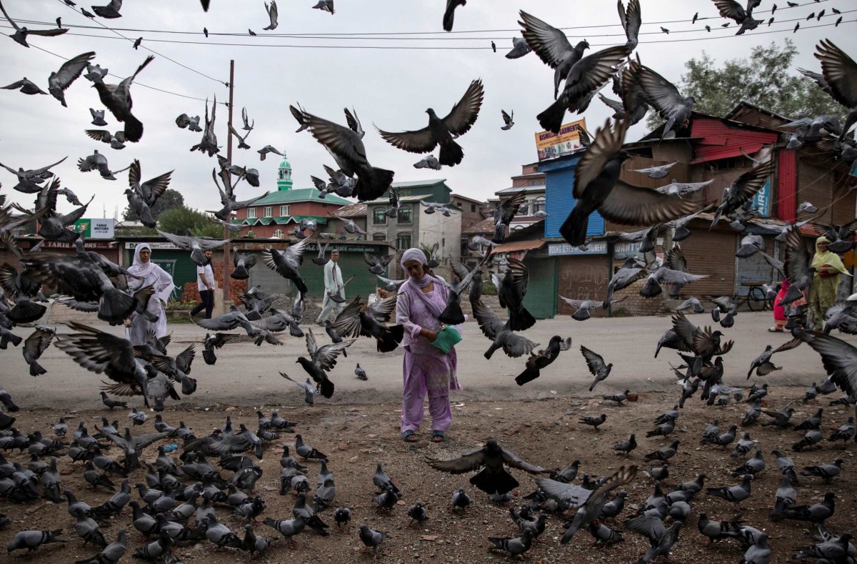 A Kashmiri woman feeds pigeons at a street during restrictions after the scrapping of the special constitutional status for Kashmir by the government, in Srinagar, August 11, 2019. Photo: Reuters/Danish Siddiqui