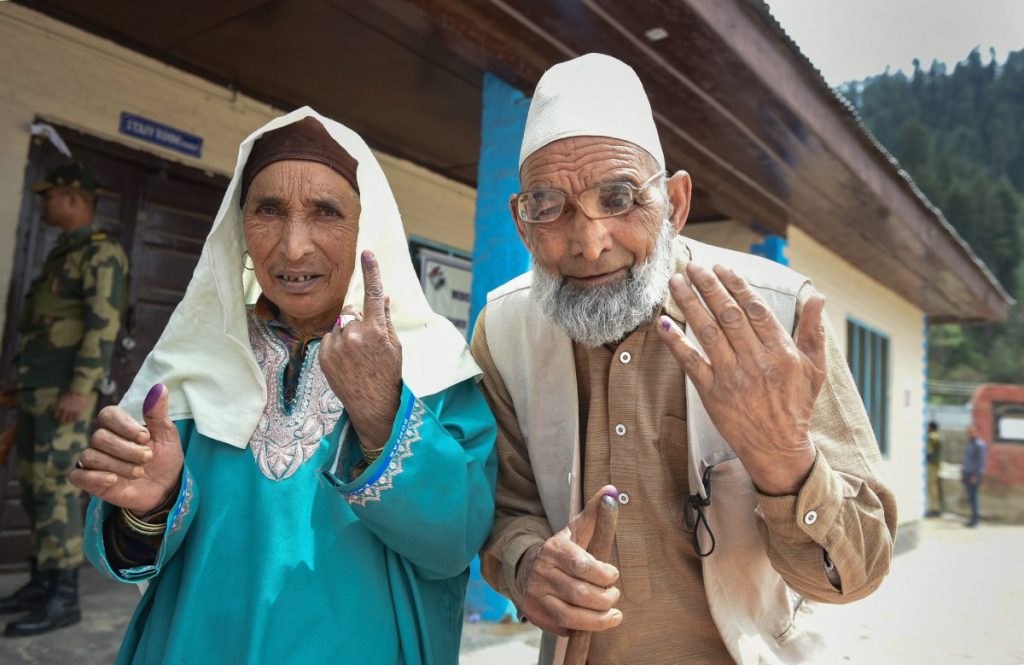 An elderly couple show their inked fingers after casting their votes at a polling station in Kupwara district in North Kashmir on April 11, 2019. Credit: PTI/S. Irfan