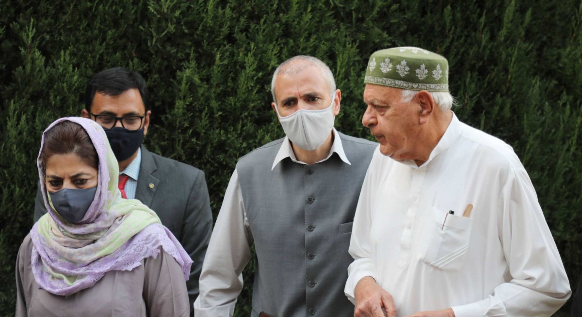 Members of Peoples Alliance for Gupkar Declaration Farooq Abdullah, Mehbooba Mufti, Omar Abdullah and others during a press conference after their meeting, at Bathindi in Jammu, Saturday, November 7, 2020. Photo: PTI