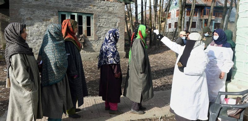 Pattan: A polling official sprays sanitizer on the hands of voters standing in a queue as they wait to cast their votes for the 7th phase of District Development Council (DDC) elections, at Archander Hama area of Pattan in Baramulla District of North Kashmir, Wednesday, Dec. 16, 2020.