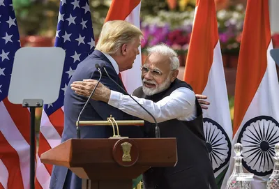 U.S. President Donald Trump is welcomed by Indian Prime Minister Narendra Modi as he arrives at Sardar Vallabhbhai Patel International Airport in Ahmedabad, India February 24, 2020. Photo: Reuters/Al Drago