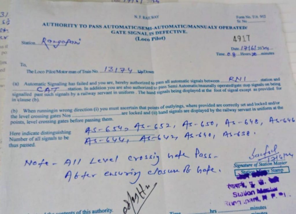 The memo read: “Automatic signalling has failed and you are hereby authorised to pass all automatic signals between RNI (Rangapani Railway Station) and CAT (Chattar Hat Junction)."