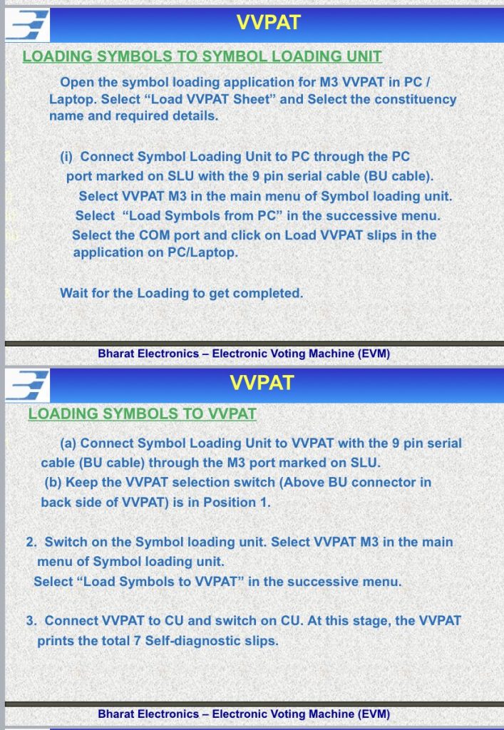 Another VVPAT manual presentation prepared by BEL gives detailed instructions as to how the VVPAT is to be connected to a device called symbol loading unit (SLU) and then how the SLU is to be connected to the laptop. It says, “Connect the Symbol Loading Unit (SLU) to PC port marked on SLU with the 9 pin serial cable (BU cable). Select VVPAT M3 in the main menu of the Symbol loading unit. Select 'Load Symbols from PC' in the successive menu. Select the COM port and click on Load VVPAT slips in the application of PC/Laptop. Wait for the loading to get completed.” Later the SLU is connected to VVPAT."