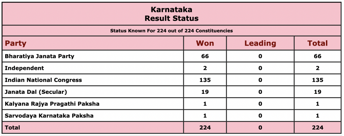 The final count from Karnataka showed the Congress easily forming a majority on its own, winning 135 of the 224 seats in the state's assembly. The Bharatiya Janata Party won 66 seats and the Janata Dal (Secular) won 19.