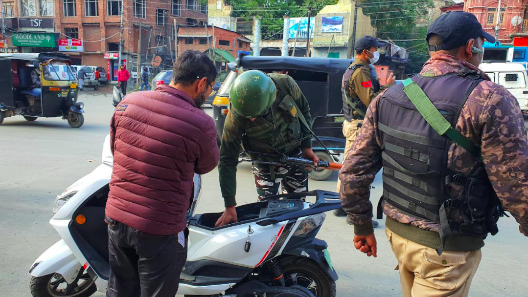 Security forces stop a motorcyclist in Srinagar. Photo: Faizan Mir