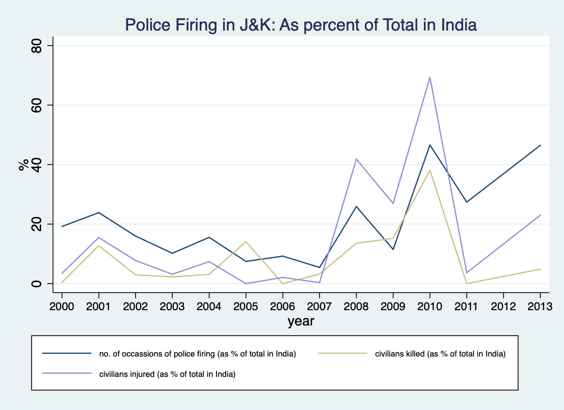 Note: In an earlier version of this article, Figure 2 – Police Firing in J&K as a Percentage of Total in India – was incorrectly plotted. The earlier, incorrect plot showed the J&K percentage as lower than what it actually was for 2010.