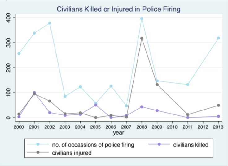 Figure 1 shows these in absolute numbers, indicating that after a steep fall post-2002, these rose to a maximum in the year 2008, when there were 396 occasions of police firings, resulting in 43 civilians being killed and 317 getting injured.