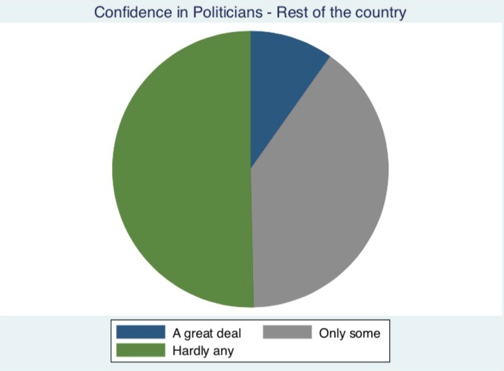 The difference in confidence that politicians will fulfil their promises, is somewhat less stark, but still massive, with 50% of the rest of the country having “hardly any confidence”, the figure being 86% for Kashmir. As is the case earlier, the latter’s confidence has declined over time, as in the first round, 69% had hardly any confidence.