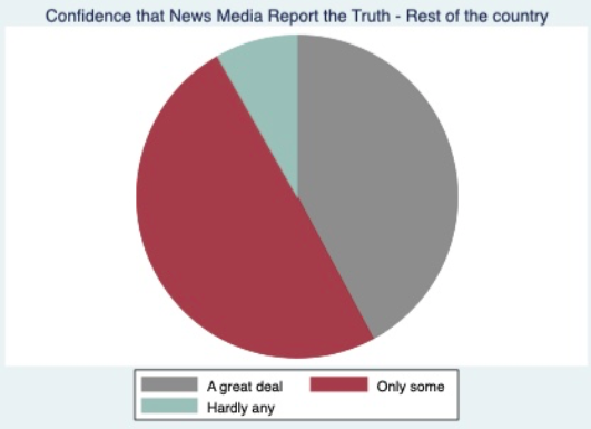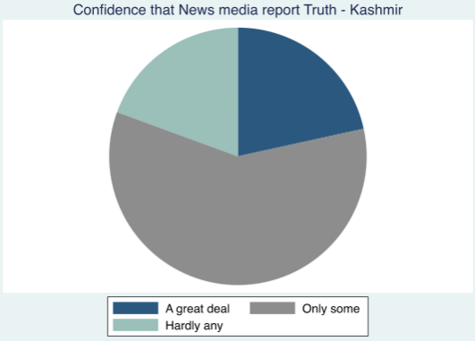 Finally, confidence that newspapers will print or broadcast the truth is “hardly any” by 19% of respondents in Kashmir, the figure being much lower at 8% for the rest of the country. Relative to all other institutions, this is a very encouraging number, although the fact that 59% of Kashmiri respondents have “only some” confidence on this parameter (49% for the rest of the country), is a dampener.