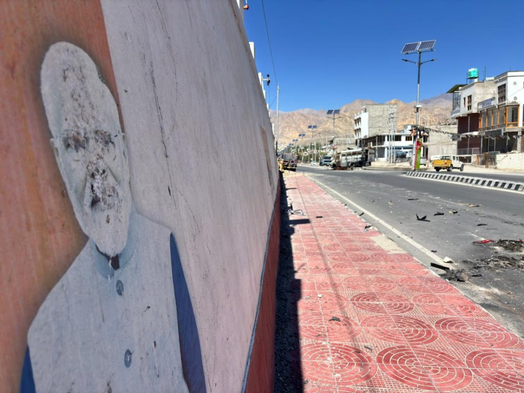 PM Narendra Modi's poster is seen destroyed in part in Leh, after the protests. Photo: Jehangir Ali.