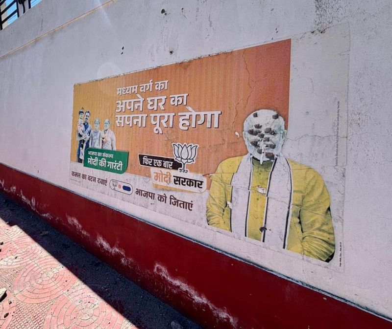 Outside the BJP office, protesters specifically targeted at least four posters from the 2024 parliamentary election featuring prime minister Narendra Modi whose face on posters appeared to have been a repeated target, leaving small gouges on the concrete wall behind.