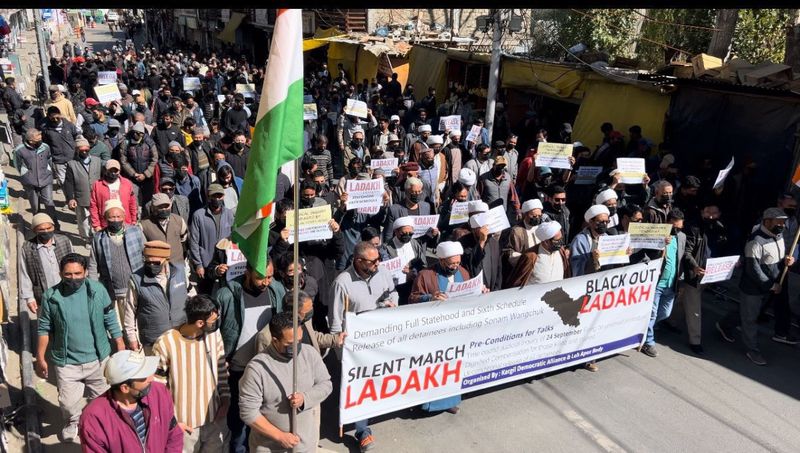 Dozens of participants wearing black armbands and black masks held placards and marched in the Kargil market while demanding Sixth Schedule status and statehood for Ladakh and release of all the detainees held by police including the incarcerated climate activist and innovator Sonam Wangchuk.