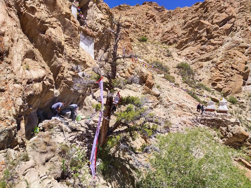 Dakmar is a cave hermitage situated four km north-west of my village, Hemisshukpachan. It is dedicated to a legendary duba, hermit monk, named Kasal Kosal who often came to Dakmar for long-duration meditation, ts’ams. The hermitage also served as a quarantine site for the 16th century Ladakhi king, Jamyang Namgyal, when he suffered from ze-nad, leprosy. The king recovered at Dakmar under the supervision of Kasal Kosal, and later under Choje Danma, a Tibetan monk who specialised in treating ze-nad.