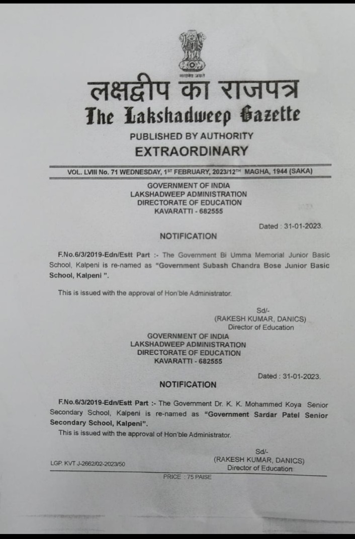 Notifications renaming two schools after Sardar Patel and Subhash Chandra Bose.