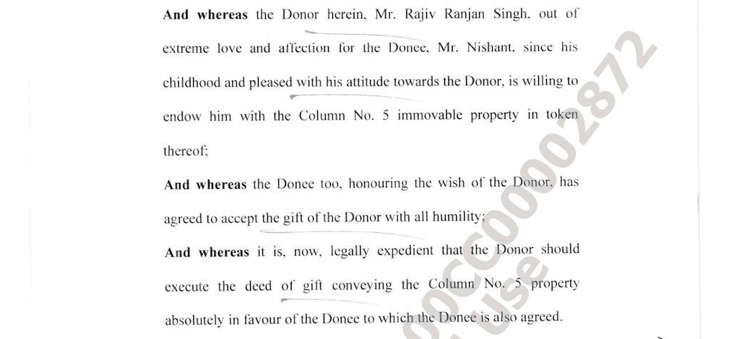 The deed states that Lalan Singh has maintained "extreme love and affection" for Nishant Kumar since his childhood. "Pleased with Nishant's attitude" towards him, Rajiv Ranjan Singh decided to endow him with this property.