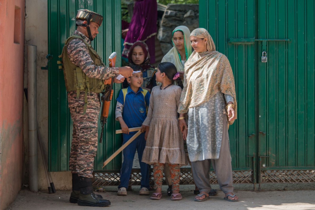 Armed forces personnel check voter IDs before allowing voters to enter a polling station at Ganeshpora, a village in Anantnag district. Photo: Umar Farooq