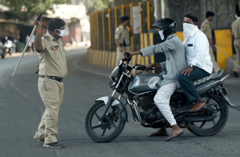 A policeman wields his baton at a man riding a motorbike as a punishment for breaking the lockdown rules, after India ordered a 21-day nationwide lockdown to limit the spreading of coronavirus disease (COVID-19) in Mumbai, March 25, 2020. Photo: Reuters/Francis Mascarenhas