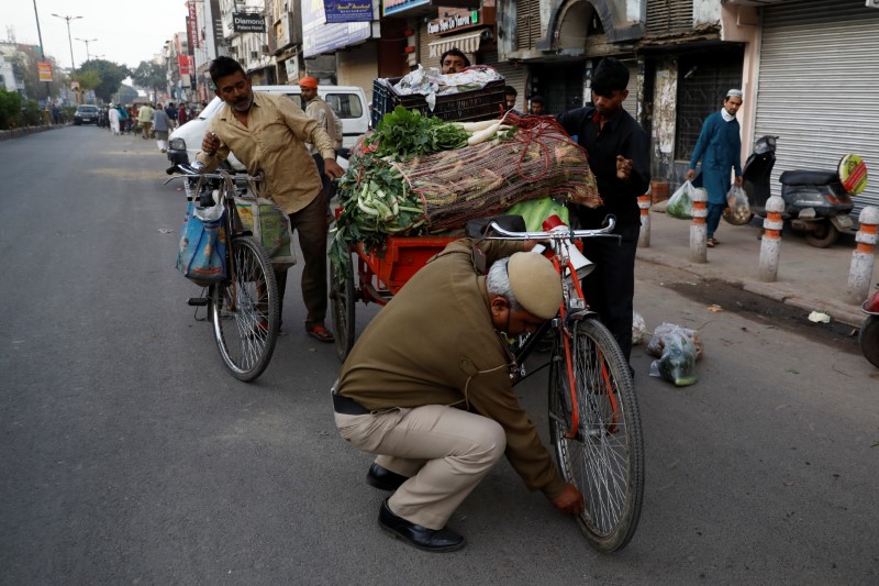 A policeman removes air from the tyre of a labourer's cart carrying vegetables, to dissuade people from crowding outside a market during a 21-day nationwide lockdown to limit the spreading of coronavirus disease (COVID-19), in the old quarters of Delhi, India, March 26, 2020. Photo: Reuters/Anushree Fadnavis