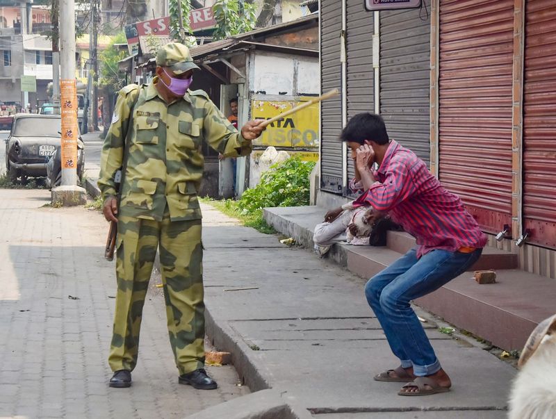 A police officer wields his baton against a man as a punishment for breaking the lockdown rules after India ordered a 21-day nationwide lockdown to limit the spreading of coronavirus disease (COVID-19), in New Delhi, March 25, 2020. Photo: Reuters/Adnan Abidi