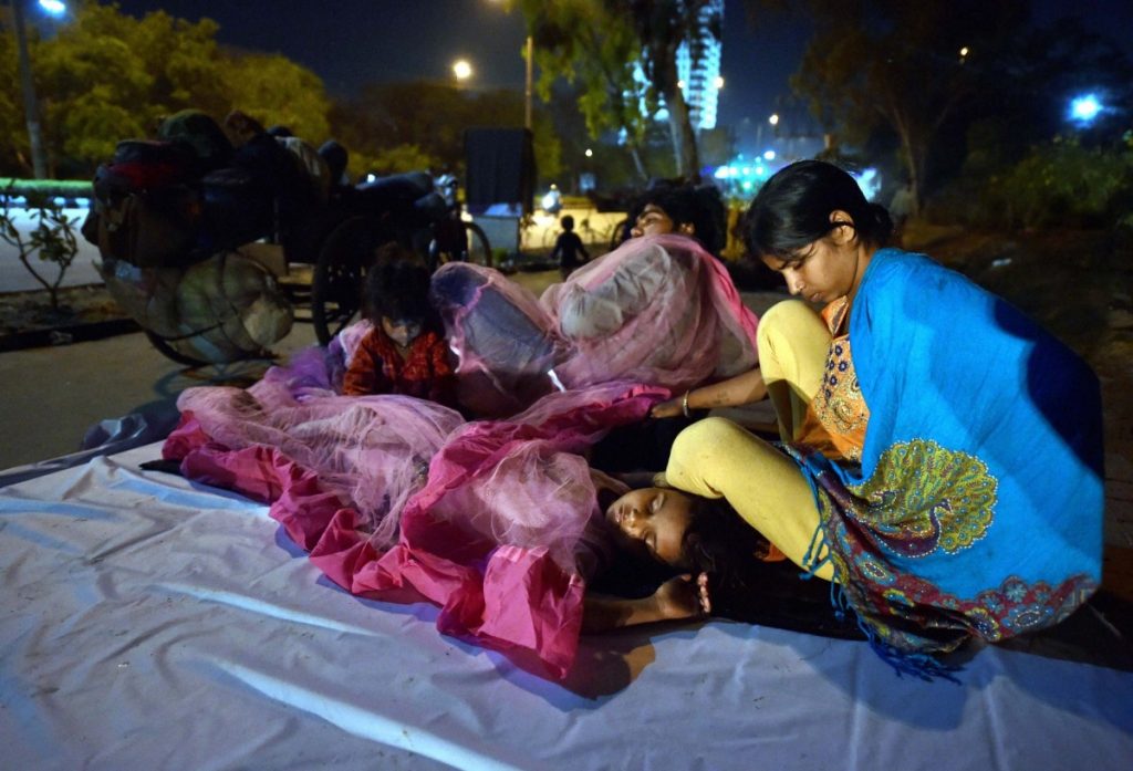 Migrant workers travelling from Gurgaon and Panipat rest in New Delhi on Thursday. Photo: PTI/Manvender Vashist