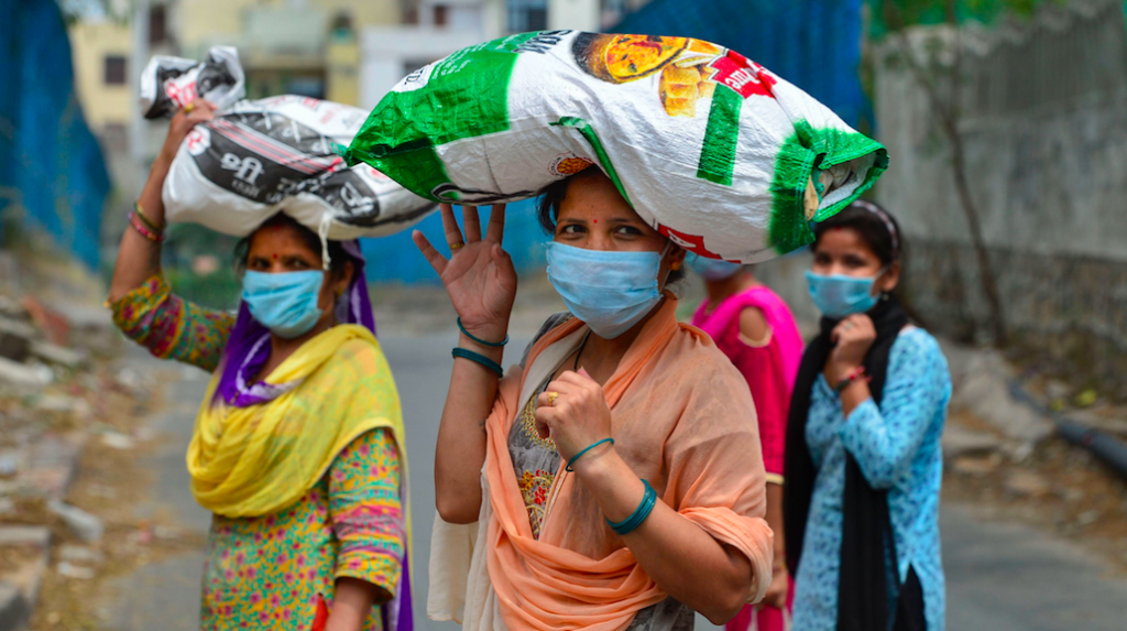Women carry free ration collected from a fair price shop during the ongoing COVID-19 nationwide lockdown, in East Delhi, Wednesday, May 6, 2020. Photo: PTI