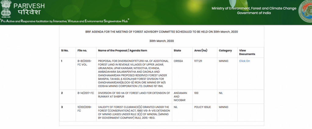 While the state of environmental monitoring is practically a no show, there is little public information on whether project approval committees are reviewing environmental approvals and forest diversions. A March 30 meeting agenda lists the diversion of 1177.21 hectares of forests for an iron ore mine in Odisha. The environment ministry has not made any public announcement on the cancellation of these meetings. There is a passing reference to some expert committee meetings for the month of March being deferred.