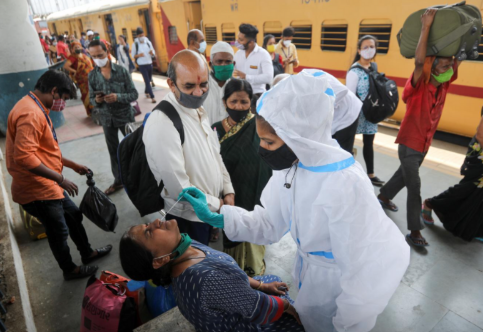 A health worker in PPE collects a sample swab from a woman during a rapid antigen testing campaign for the coronavirus disease, at a platform in Mumbai, March 17, 2021. Photo: Reuters/Francis Mascarenhas/File photo