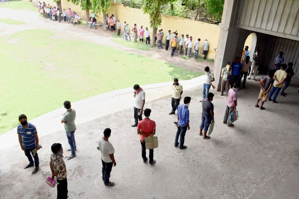 People practice social distancing as they stand in queue to collect food in Murshidabad, West Bengal, April 30, 2020. Photo: PTI