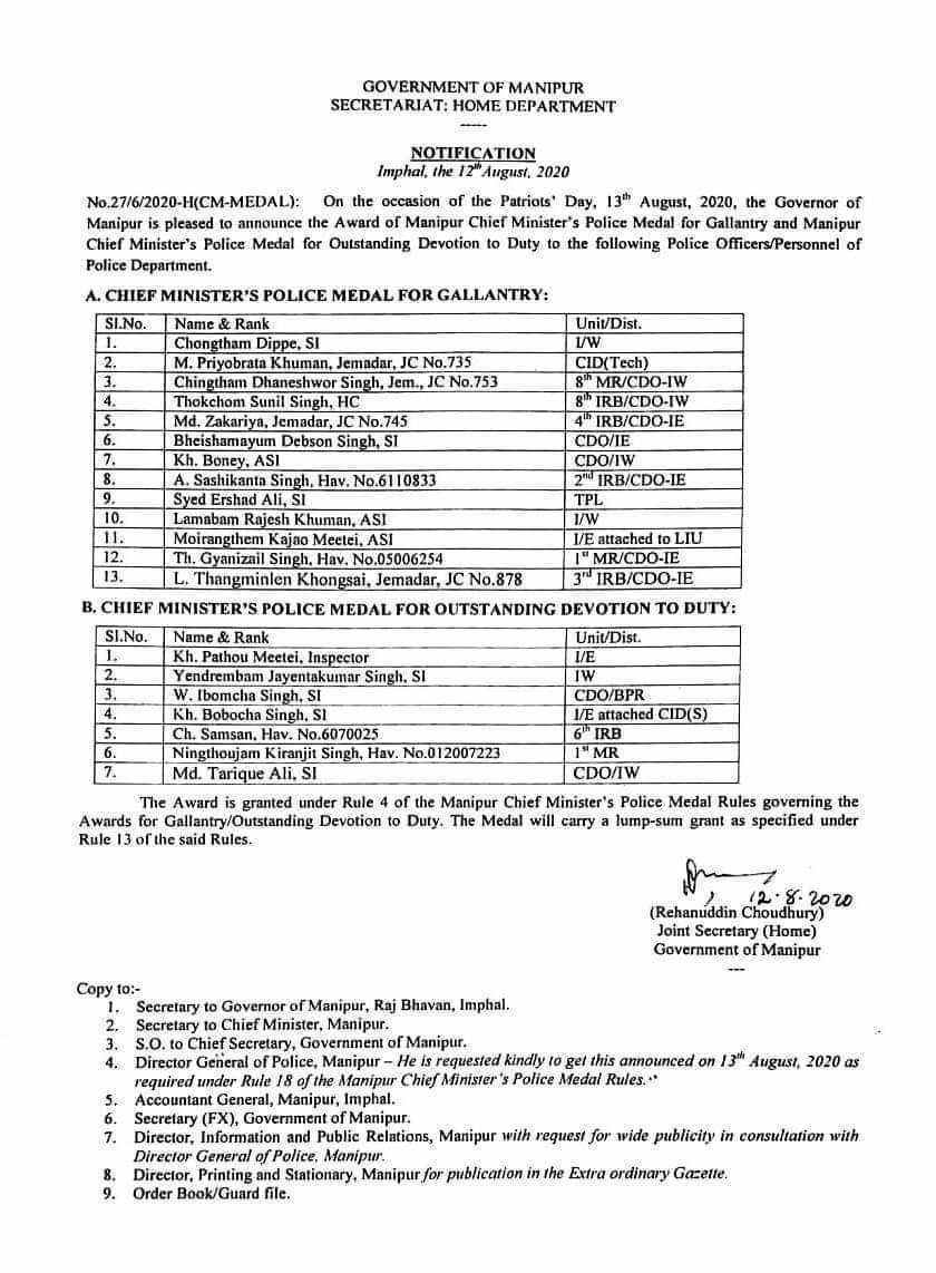 A list of Manipur policemen awarded on Patriots Day.