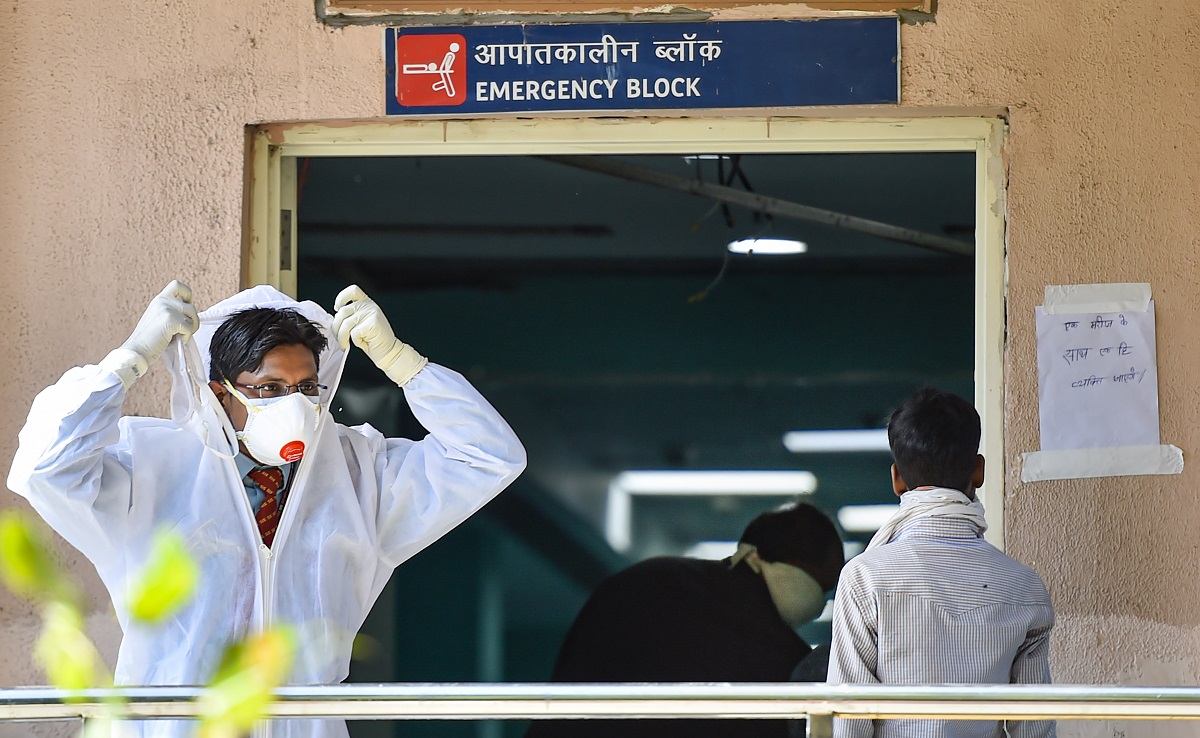 A security guard wearing protective gear is seen at RML Hospital in New Delhi, Monday, March 30, 2020. Photo: PTI/Ravi Choudhary
