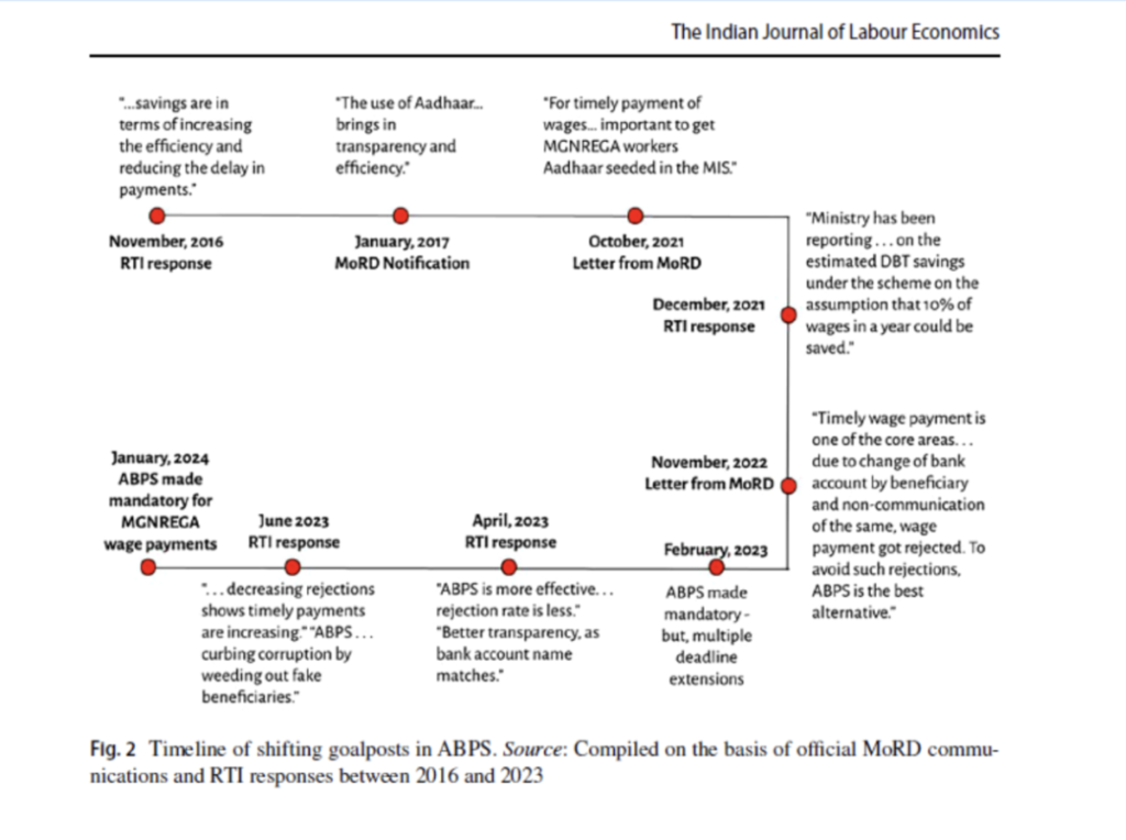 In Figure 2, observe the letter provided by the Ministry of Rural Development (MoRD) in October, 2021, which explicitly mentions that “For timely payment of wages it is important to get MGNREGA workers Aadhaar seeded in the MIS. In November, 2023, a letter from the MoRD mentions “Timely wage payments is one of the core areas” and says that the “ABPS is the best alternative” to “avoid rejections.” Similar reasoning was obtained in June, 2023 as well.