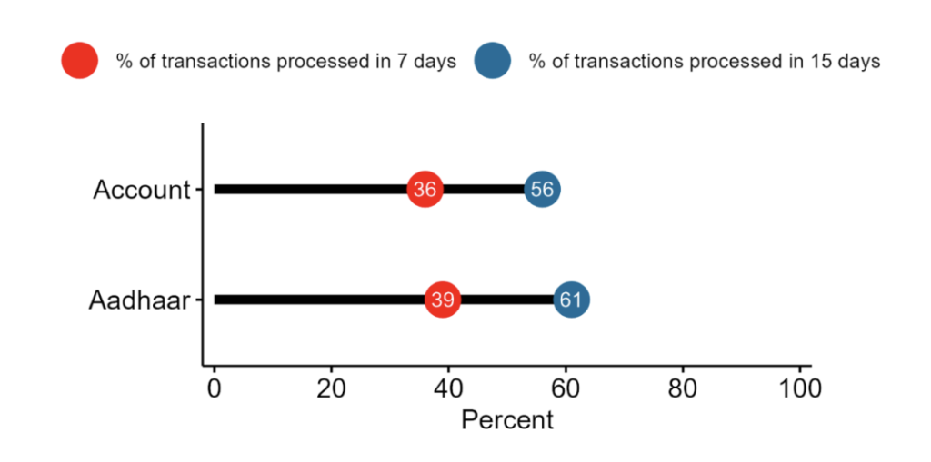 In our sample, there are 18.94 million (1.89 crore) account-based transactions and 12.41 million (1.24 core) ABPS transactions. Figure 3 shows the percentage of payments processed within seven and 15 days across the two payment types. 36% of account-based payments were processed within seven days compared to 39% of ABPS payments, while 56% of the account-based payments were processed within 15 days compared to 61% of ABPS payments.