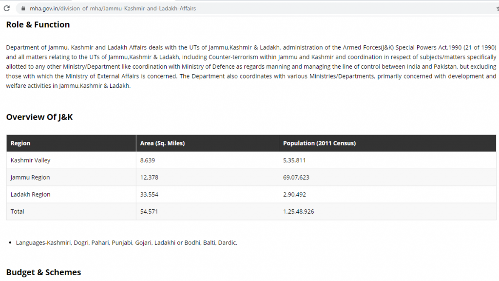 New Delhi: The official website of the Ministry of Home Affairs (MHA) has made an erroneous claim concerning the population of Jammu and Kashmir, underreporting the population of the Kashmir valley by more than 10 times.