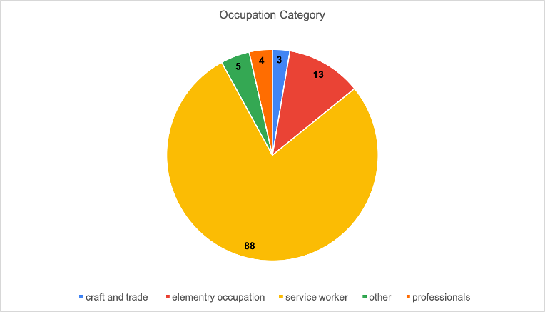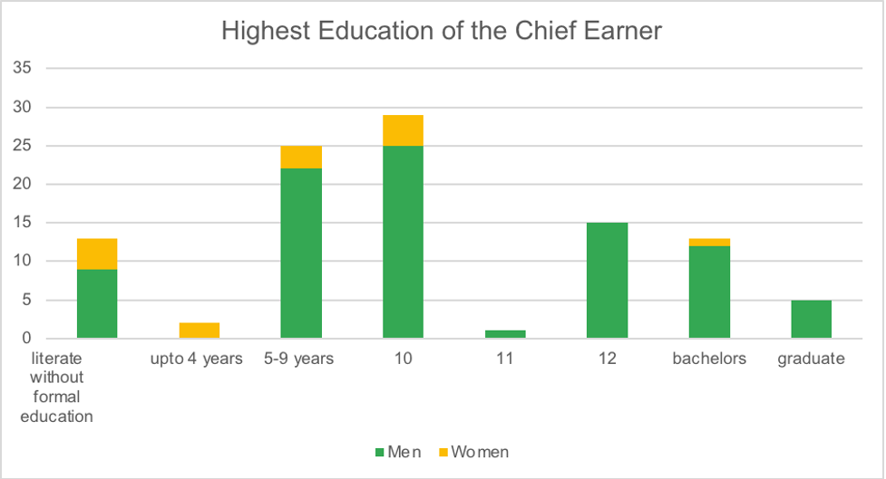 Out of 113 residents of Kapashera interviewed, 87.6% of the respondents are male (being the principal wage earner) and average age of our respondents was 34. The highest education level of each respondent varied from being literate with some high school education (mostly from another state), to those without any formal education, to those who were trained as graduates. Most worked in the self-employed, casual work occupation category within the area of Kapashera itself, while others, with certain skills and tradecraft, found work in textile-export factories near the Gurugram border area and in workshops located in Udyog Vihar.