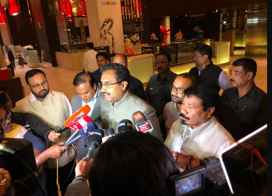 Ram Madhav, BJP national security in charge of Northeast speaking to reporters in Guwahati after the AGP-BJP alliance on March 12. Credit: Twitter