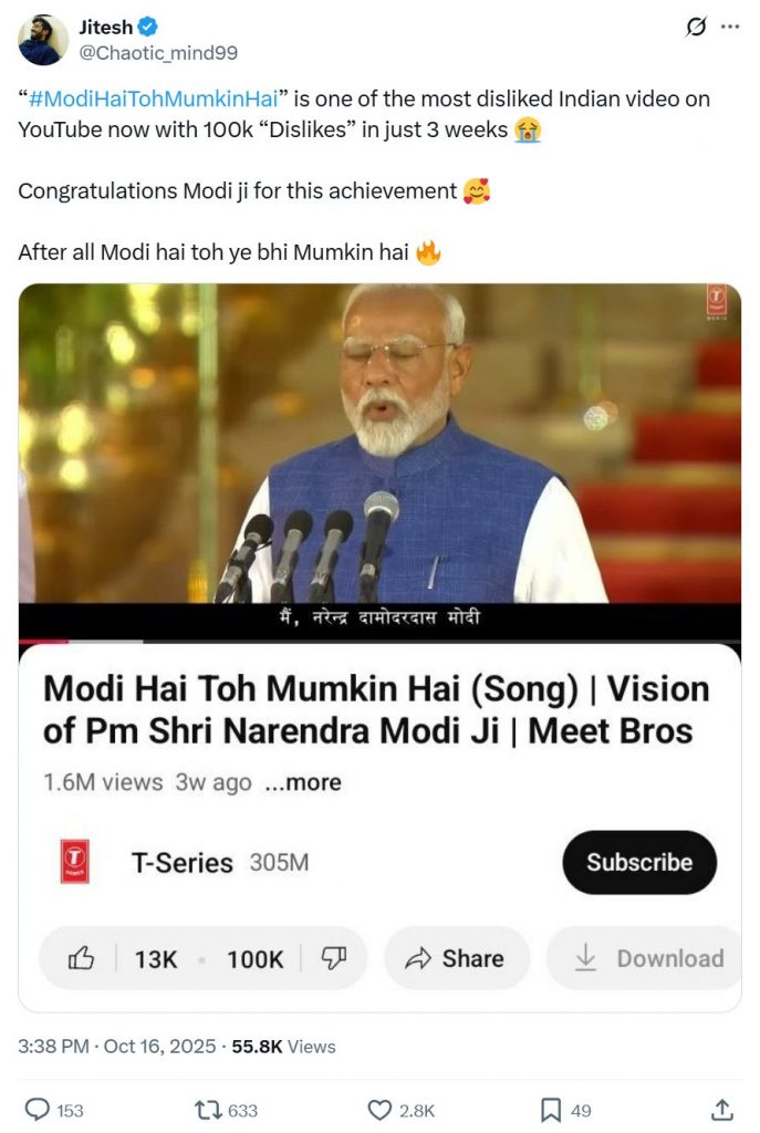 In the run-up to the Bihar assembly elections, a song, “Modi hai to mumkin hai”, released on YouTube on September 22 by T Series, has sparked a debate. Several social media users, including leaders from opposition parties, noted that the video received a large number of dislikes. To support this, they shared screenshots showing both likes and dislikes, where the number of dislikes outnumbered likes.