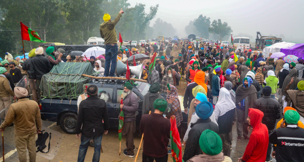 Farmers stage a demonstration to block Prime Minister Narendra Modis cavalcade, in Ferozepur, January 5, 2022. Photo: PTI