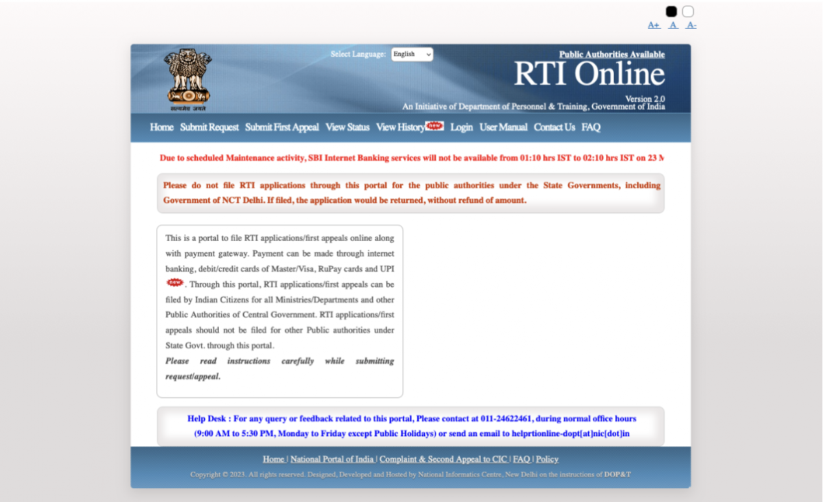 A screenshot of the RTI Portal without Narendra Modi’s photograph. Photo: https://rtionline.gov.in/