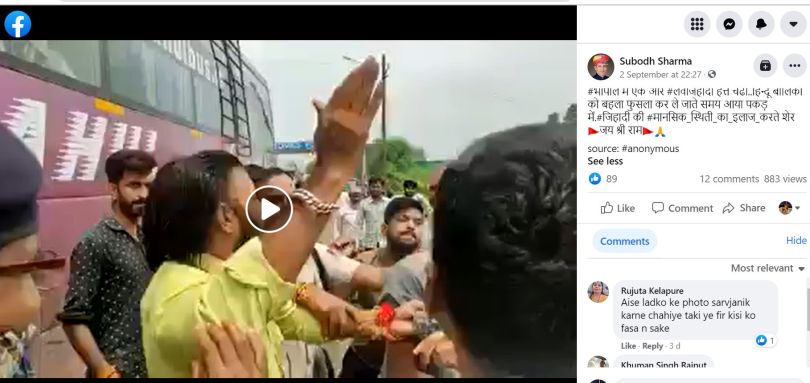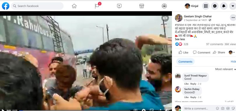 A video of a group of people beating a boy in police presence over an alleged case of ‘love jihad’ is widespread on social media. It is being claimed that a Muslim boy had convinced a Hindu girl to elope with him in Bhopal. Facebook user Geetam Singh Chahar posted the footage with the same claim. It garnered 36,000 views at the time of writing. (Archive link)