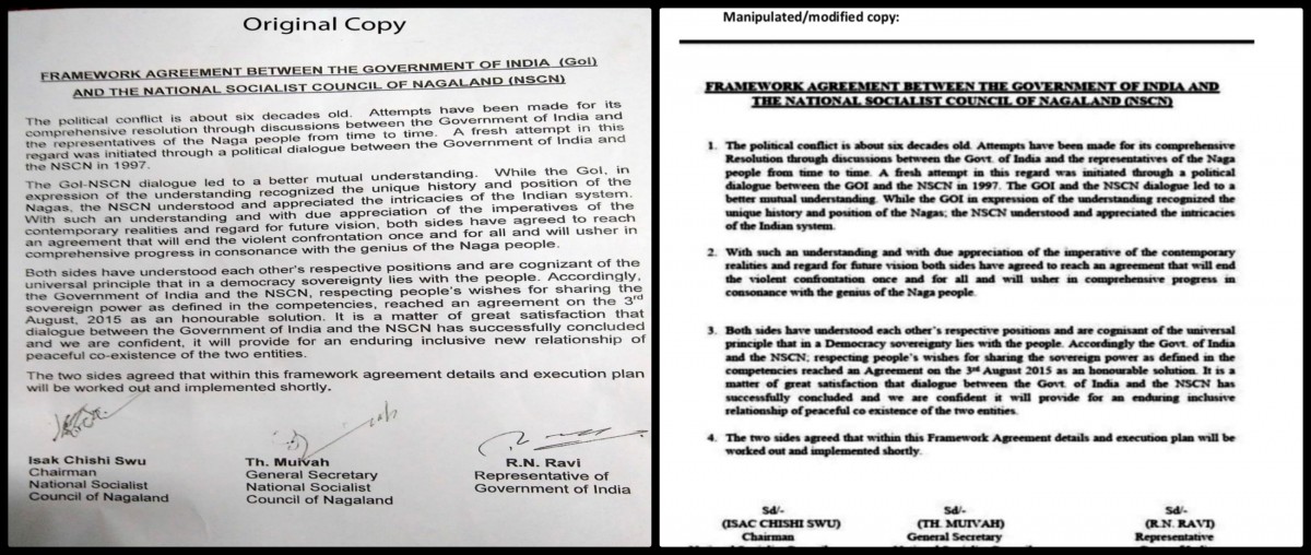 It also, at the moment, doesn’t want to hold responsible the Naga leaders for the division of opinion between them, instead making Ravi the sole factor behind it. They couldn’t have acted otherwise, the NSCN is arguing, because Ravi handed out a “doctored” copy of the agreement to them.