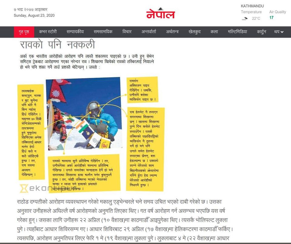 On August 25, mountaineering world record holder Satyarup Siddhanta published on Facebook two photos, one that was carried in the Nepal newspaper and another showing seemingly the same person in the same posture and clothing, only with a slightly different background and the oxygen mask missing, revealing lower half of his face. Dozens of mountaineers commented on Siddhanta’s post, calling the photos morphed.