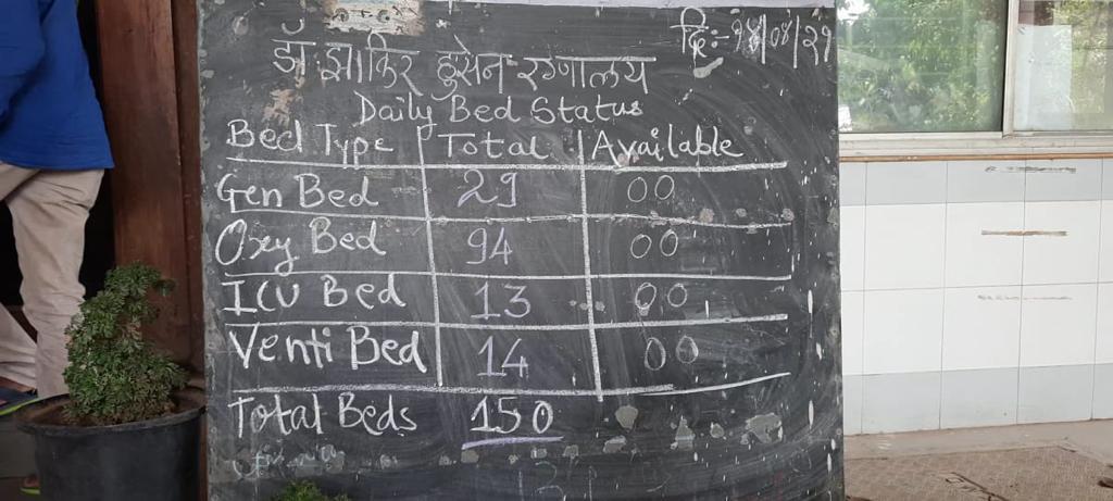 The government hospitals in Nashik are no better. Though they manage to get their oxygen and medicine supplies, they have no beds left. In Zakir Husain NMC hospital, one of the biggest in Nashik, a board announces there are no beds available.