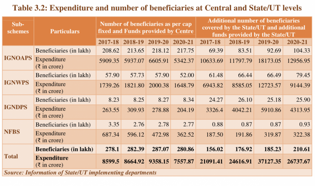 According to the CAG report, the Union government spent Rs 34,432 crores on NSAP. According to Union Budget documents, the expenditure on NSAP in these years is slightly higher, at Rs 35,052 crores. But the states together spend Rs 1,09,044 crores on top-ups (additional money to make up for the low amounts provided by the Union government) and additional beneficiaries, over and above those supported by the central scheme.