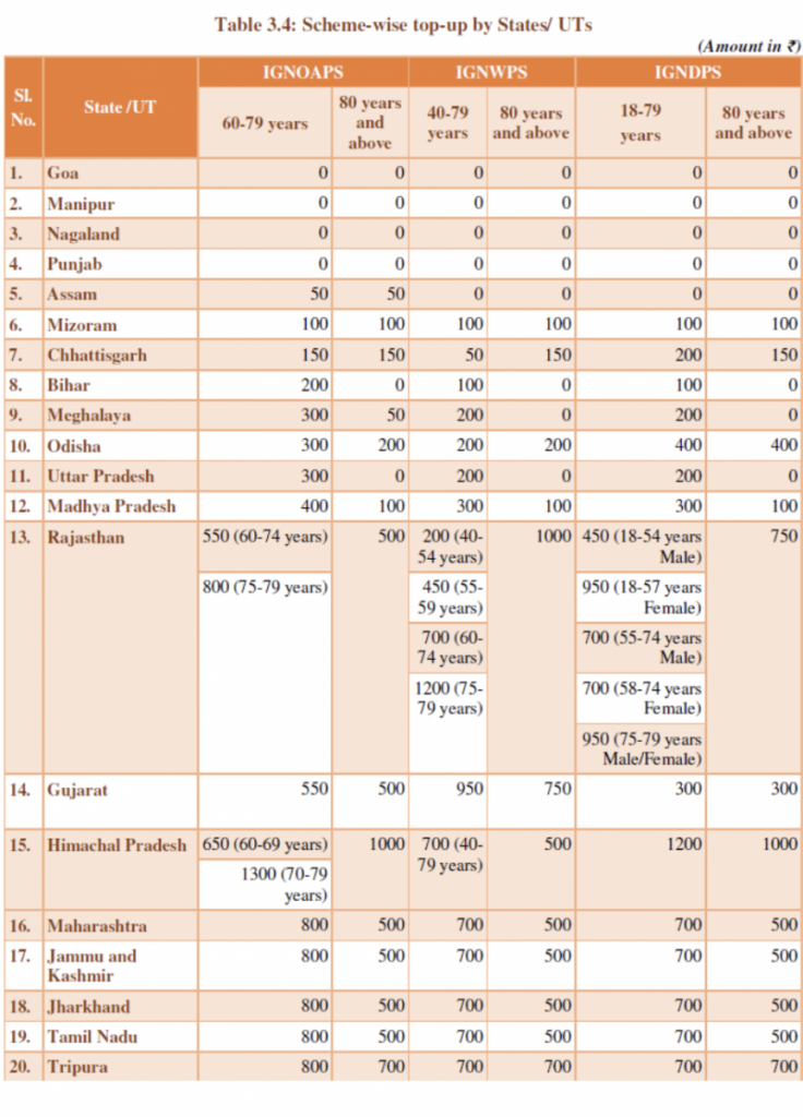 One, to top-up the pension amount because the central contribution is measly (Rs. 200-500 per month). The top-ups range from Rs. 150-200 (in Chhattisgarh and Bihar) to Rs 2,300 (in Haryana and Andhra Pradesh). Table 3.4 below, reproduced from CAG report, has state-wise top ups.