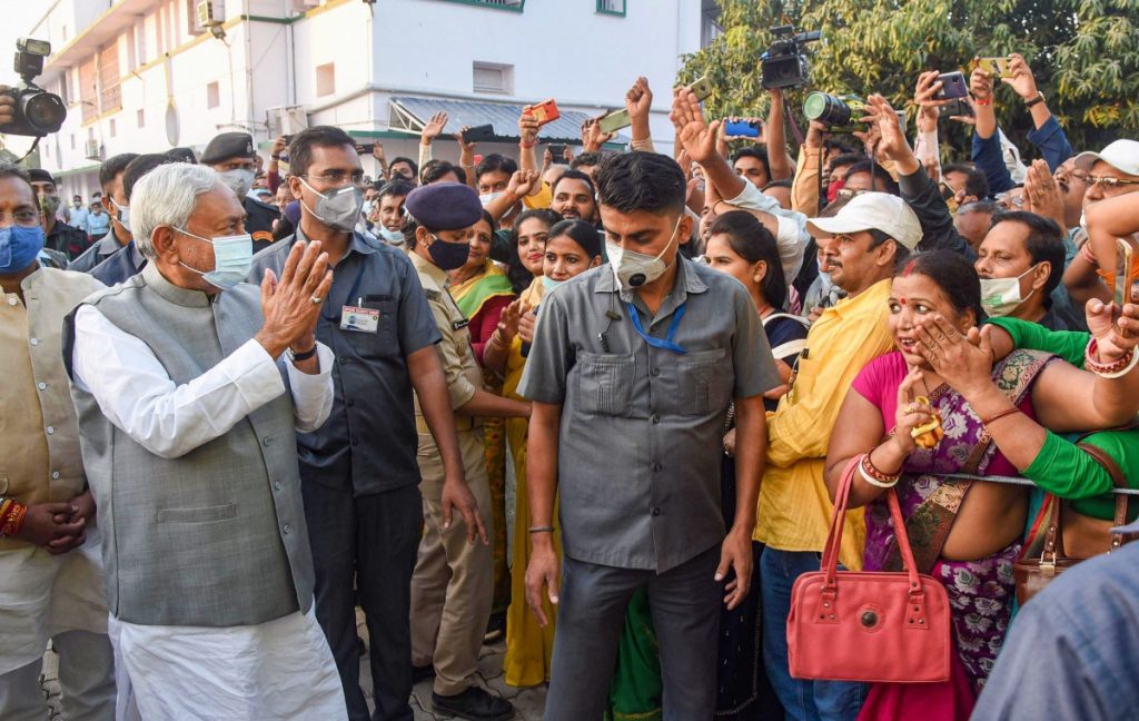 Janata Dal (United) President and Bihar Chief Minister Nitish Kumar being greeted by party supporters as he arrives at party office, in Patna, Thursday, November 12, 2020. Photo: PTI